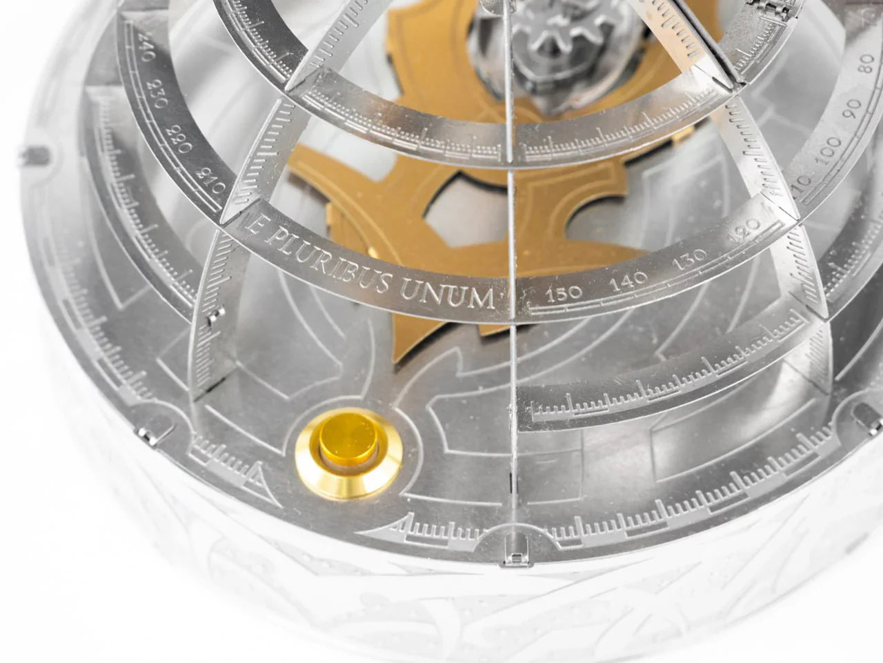 Beneath the powerful wings of the Great Eagle rests a masterfully crafted hemisphere. Engraved on its surface is the historic motto: “E Pluribus Unum” — “Out of many, one” — a timeless tribute to unity across diversity. The base of the hemisphere is further enhanced with three-dimensional overlays and decorative star-lined stripes, evoking the feel of classic emblems and national insignias